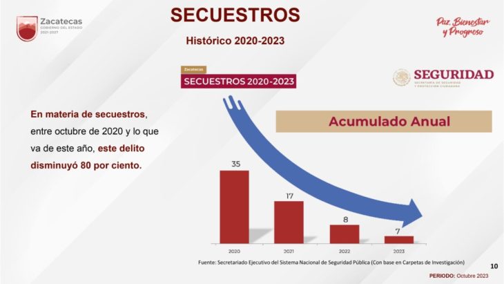 Zacatecas, Zac., 30 de noviembre de 2023.- Como resultado del Plan Zacatecas II, implementado por el Presidente Andrés Manuel López Obrador y el Gobernador David Monreal Ávila para lograr la pacificación del estado, el delito de secuestro, entre 2021 y 2023, ha disminuido en la entidad en 80 por ciento, de acuerdo con los datos que arroja el Secretariado Ejecutivo del Sistema Nacional de Seguridad Pública (SESNSP).