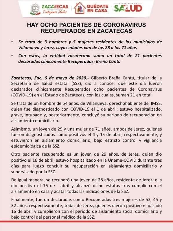 Zacatecas.- Los Servicios de Salud de Zacatecas, al corte del 6 de mayo, informaron de 4 nuevos casos positivos de Coronavirus en la entidad. La ciudad de Zacatecas acumula en total 31 casos confirmados de coronavirus; seguida por la ciudad de Jerez, con 30 casos.