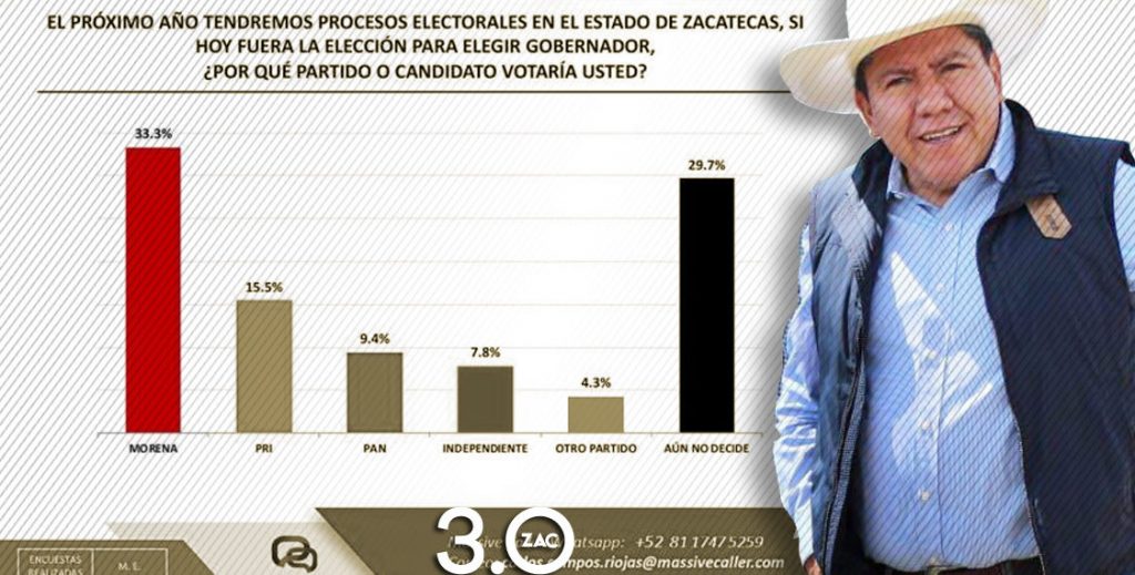 Massive Caller muestra en su encuesta que en las preferencias electorales por partido y por aspirantes a la gubernatura, si hoy fueran las elecciones, el partido Movimiento de Regeneración Nacional (Morena) ganaría con 33.3 por ciento de los sufragios, en tanto, David Monreal Ávila, se sitúa como el preferido con 30.1 por ciento para representar al mismo partido.