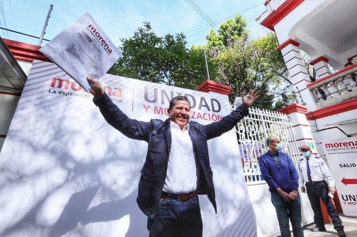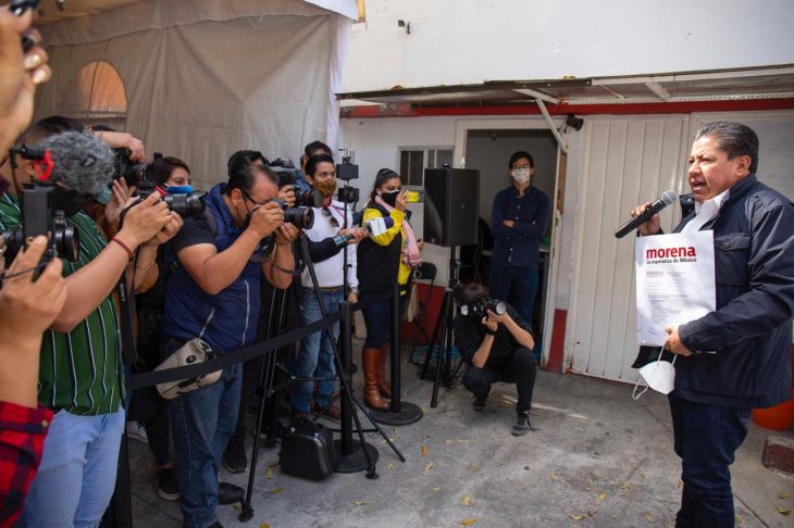 quien acudió a la sede nacional morenista acompañado de alcaldes, legisladores, líderes sociales y simpatizantes.
