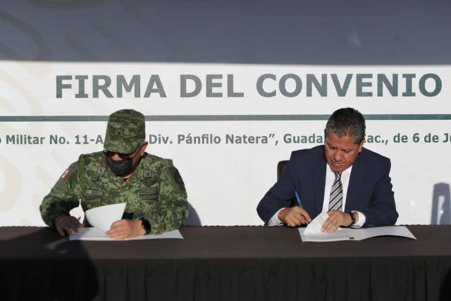 Guadalupe, Zac.- El Gobernador David Monreal Ávila firmó el Convenio de Colaboración en Beneficio de los deudos del personal militar y Guardia Nacional fallecido o que adquirió una incapacidad con motivo de operativos militares, con un sentido reconocimiento a su participación en el cumplimiento de la estrategia de pacificación que el Presidente Andrés Manuel López Obrador ha implementado para Zacatecas y el país.