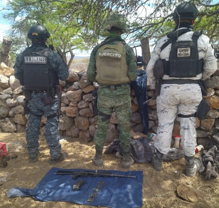 - En ese sitio se localizaron y aseguraron un arma de fuego larga, un cargador, cartuchos; además, hallaron rastros de alimentos y artículos de uso personal