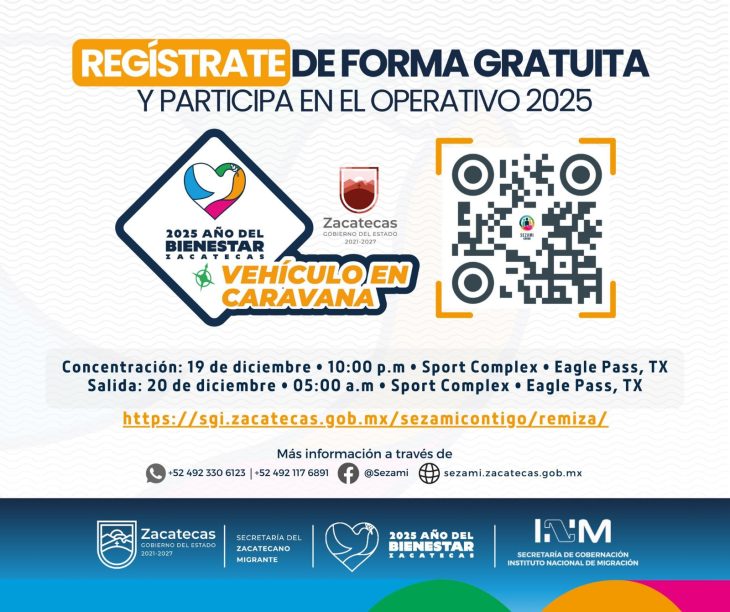 Dicho operativo es coordinado por la representación en Zacatecas del Instituto Nacional de Migración (INM) en colaboración con el Gobierno Estatal, a través de las dependencias involucradas, como Sezami y la Secretaría de Seguridad Pública, cuyo titular, el General Arturo Medina Mayoral, ha sido pieza fundamental en apoyar las acciones por el bienestar de la comunidad zacatecana migrante.