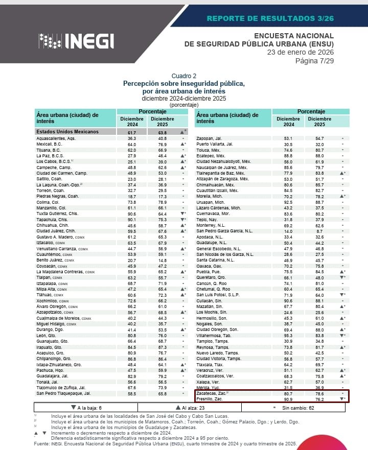 En el caso de Fresnillo, la percepción de inseguridad alcanzó 76.2 por ciento en diciembre de 2025, lo que representa una reducción estadísticamente significativa de 14.7 puntos porcentuales en comparación con diciembre de 2024, cuando se ubicó en 90.9 por ciento.