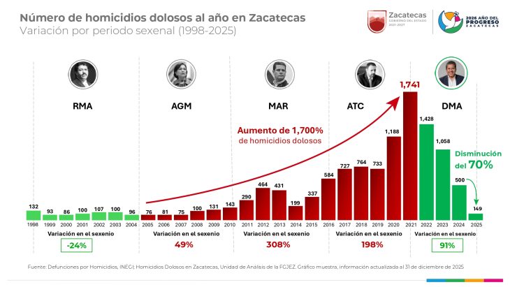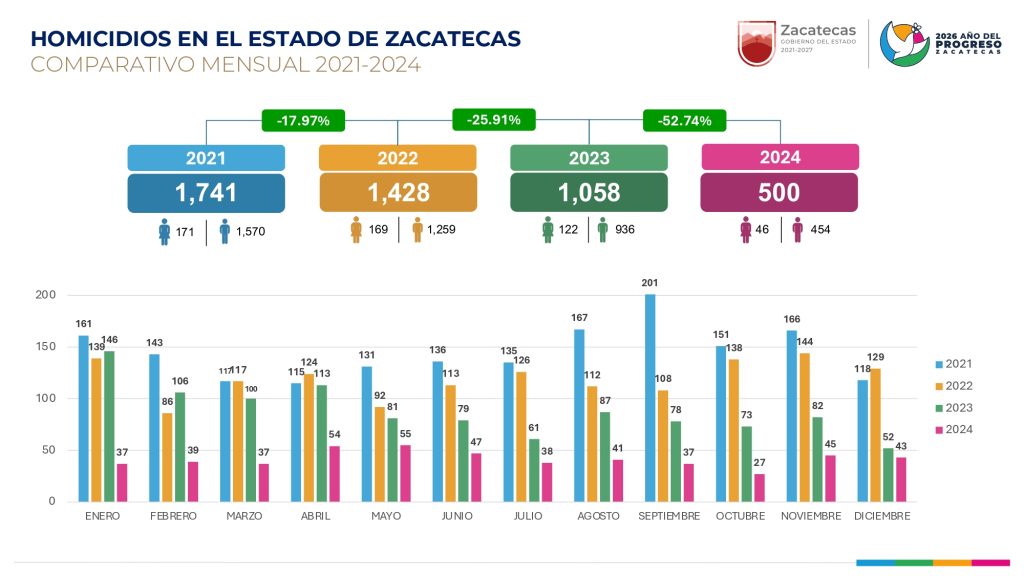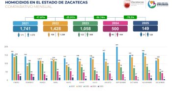 Zacatecas, Zac.- Las cifras oficiales sobre homicidios en el estado de Zacatecas reflejan una disminución sostenida y significativa de la violencia letal en los últimos años, de acuerdo con los comparativos mensuales 2021–2024 y el análisis histórico por periodo sexenal de 1998 a 2025.