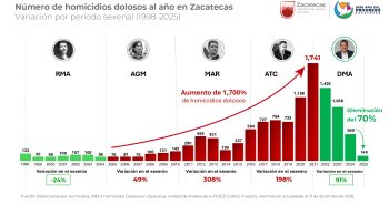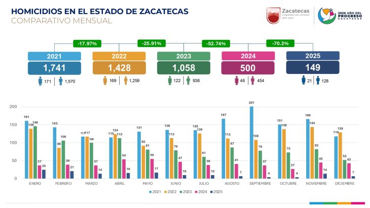 Zacatecas, Zac.- Las cifras de homicidios en el estado de Zacatecas muestran una tendencia sostenida a la baja en los últimos cinco años, de acuerdo con el comparativo mensual presentado por el Gobierno del Estado. Entre 2021 y 2025, la reducción acumulada alcanza 70.2 por ciento, al pasar de 1,741 homicidios registrados en 2021 a 149 en 2025.