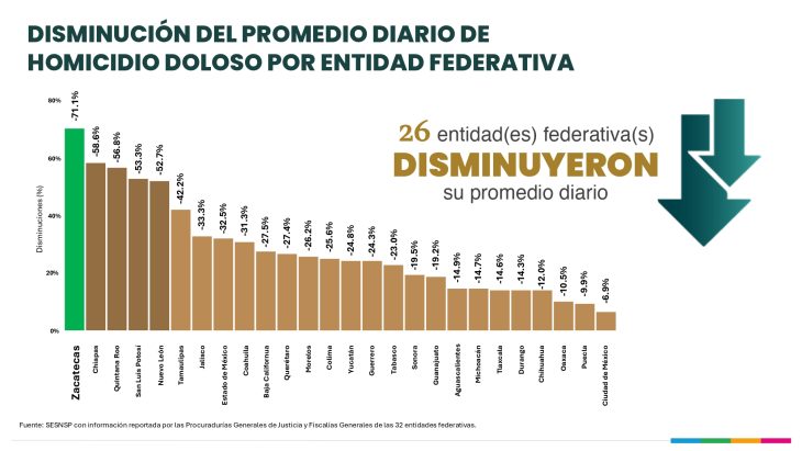 El reporte señala que 26 entidades federativas lograron disminuir su promedio diario de este delito, reflejando una tendencia a la baja en gran parte del país. Después de Zacatecas, los mayores descensos se registraron en Chiapas (-58.6%), Quintana Roo (-56.8%), San Luis Potosí (-53.3%) y Nuevo León (-52.7%).