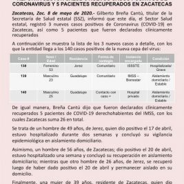 Zacatecas.- Actualmente, en Zacatecas hay un total de 140 personas -al sábado 8 de mayo- infectadas por el nuevo coronavirus desde el primer positivo, según los últimos datos oficiales...