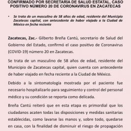 Confirman nuevo caso de Coronavirus en Zacatecas;...