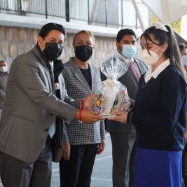 Entrega alcalde Jorge Miranda paquetes escolares a estudiantes de secundaria.