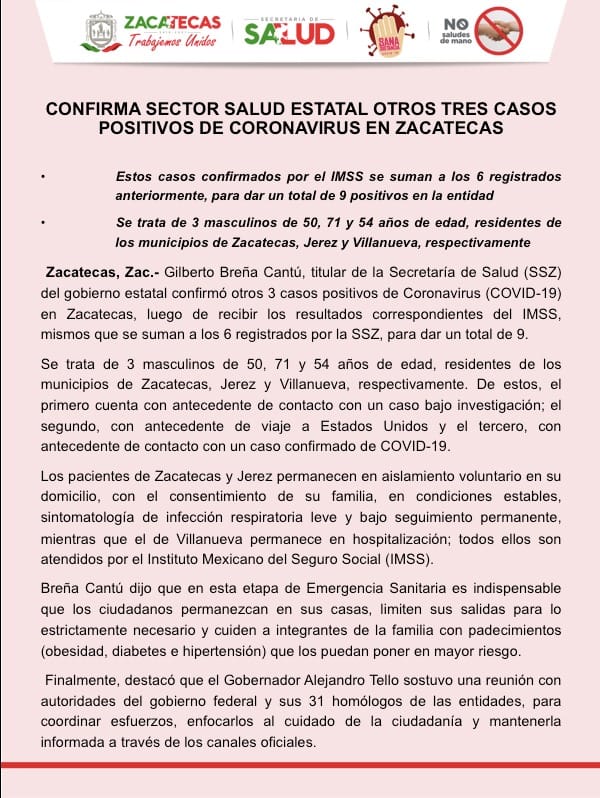 Confirman 3 casos positivos de Coronavirus en Zacatecas.1 abril 2020Zacatecas Al MinutoZacatecas Capital216 Views coronavirus Previous postGrupo Modelo entrega 300 mil botellas de gel antibacterial al IMSS. Next postConfirman primer caso de Coronavirus en Jerez.About author View all posts Zacatecas Al Minuto