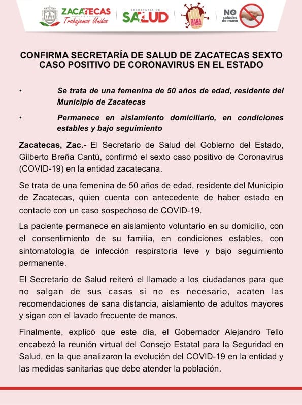 Confirman sexto caso de Coronavirus en Zacatecas.30 marzo 2020Zacatecas Al MinutoZacatecas Capital162 Views Previous postOfrece Secretaria de Finanzas estímulos fiscales ante pandemia de Coronavirus. Next postMulta de 3 mil pesos para personas que salgan sin justificación en Guadalupe.About author View all posts Zacatecas Al Minuto