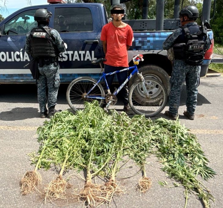 Durante un recorrido de vigilancia, los elementos de seguridad detectaron a un masculino que transportaba en bicicleta seis plantas con características propias de la marihuana, de aproximadamente dos metros de altura cada una.