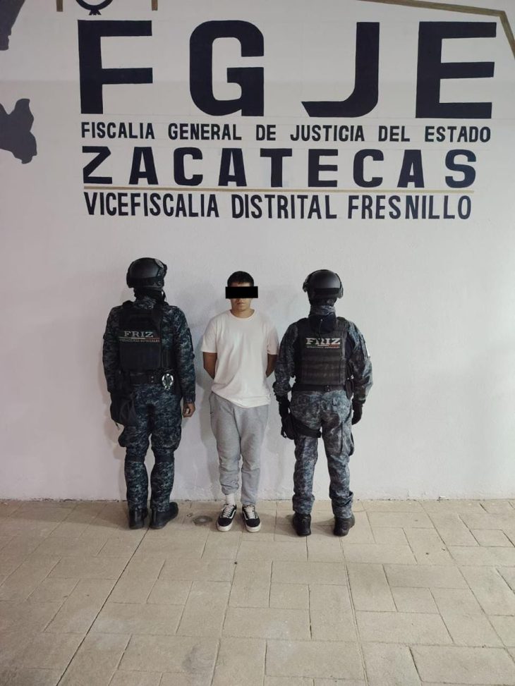 Fresnillo, Zac., 24 de agosto de 2025.- En acciones de vigilancia sobre la calle Prolongación García Salinas, municipio de Fresnillo, elementos de la Fuerza de Reacción Inmediata Zacatecas (FRIZ) detuvieron a un masculino en posesión de probable droga y una réplica de arma de fuego.